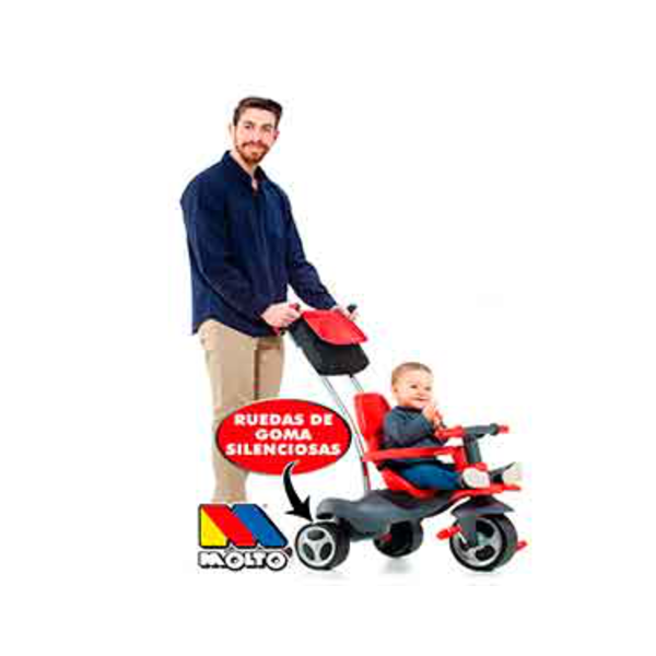 Triciclo evolutivo con un diseño ligero, y un nuevo sistema de conducción SOFT CONTROL que facilita el manejo a los padres. El triciclo cuenta con una estructura metálica resistente, ruedas de goma silenciosas y mango desmontable. Incluye, además, dirección asistida desde el mango, cinturón de seguridad, 1 bolsa para guardar cosita, soporte para pies, 1 arco de seguridad extraíble y pedales antideslizantes. El triciclo evoluciona hasta en 5 formas diferentes dependiendo de las necesidades del niño/a según su edad. Edad recomendada de 10 meses a 3 años.