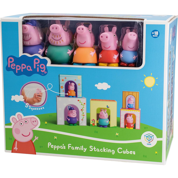 CUBOS APILABLES. Estos cubos están diseñados con imágenes de Peppa Pig, su familia y amigos, lo que añade un toque especial a éste clásico juguete para los pequeños fanáticos de la serie. Pasarán largos ratos de diversión imaginando y creando.