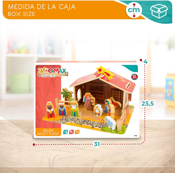 Belén de madera natural Woomax, consiste en un establo con tejado y ventajas sobte una base pintada con vallado y figuras para jugar