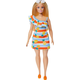 Muñeca Barbie con cuerpo original y el pelo rubio. Barbie está lista para el verano con su bonito vestido de estampado tropical en tonos naranjas y amarillos, con una cinta rosa satinada de adorno en la cintura.